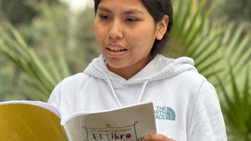 Ruth Celina reading on her university campus in Lima
